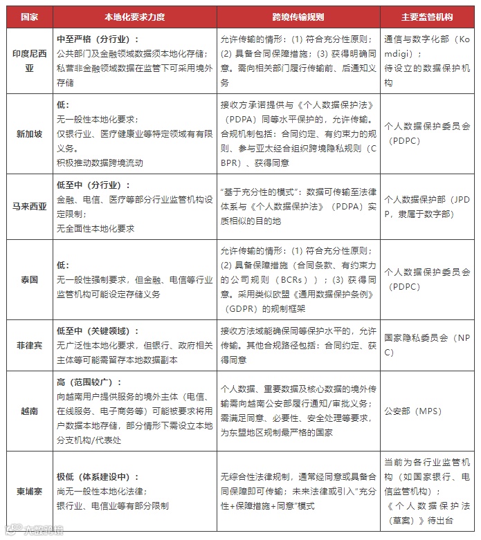 本说明涵盖东南亚国家的数据本地化及跨境数据传输要求