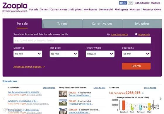 Zoopla是全英第二大的地产网站,是Rightmove强有力的竞争对手,能够提供英国住房售价趋势、受欢迎的住房区域、当前房价估值和其他的房屋买卖信息。在租房服务上,它也是由正规的中介发布房屋信息。