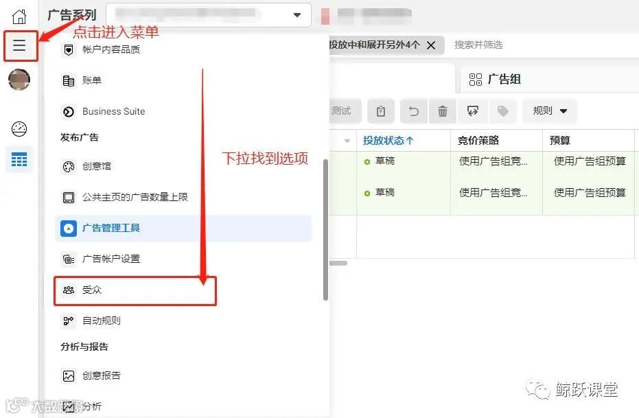 - 进入广告管理工具,在侧边栏选择「业务工具」->「受众」。