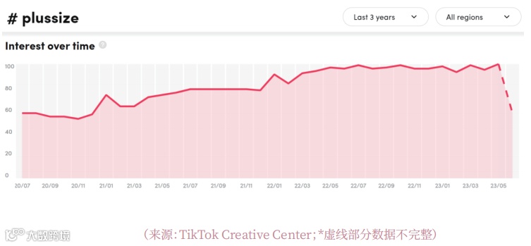 #plussize标签及相关“身材自信”话题在欧美TikTok平台热度持续攀升。近一年相关视频增加100万条,总数超400万,累计播放量达257亿次[k]。内容涵盖情绪激励、饮食健身及穿搭分享,尤以新衣试穿与搭配展示最受欢迎[k]。