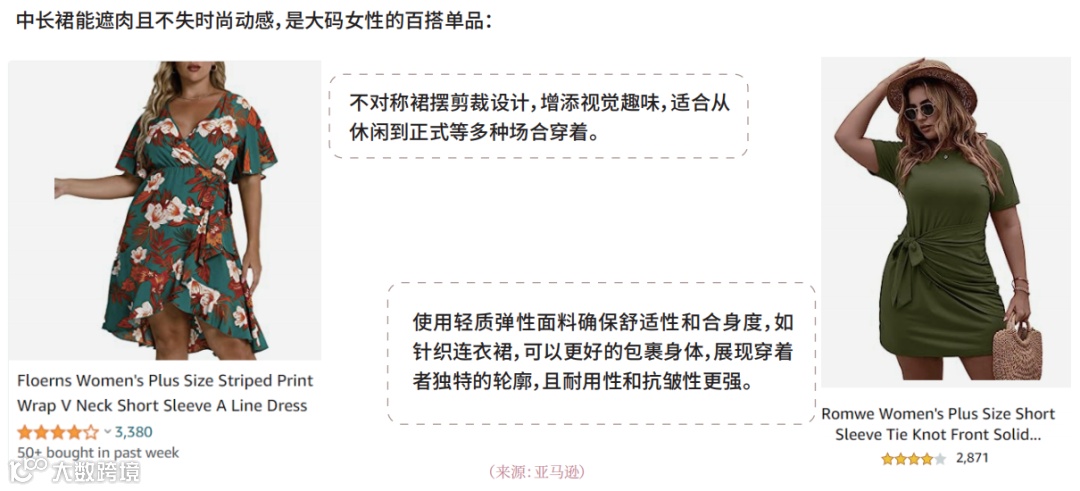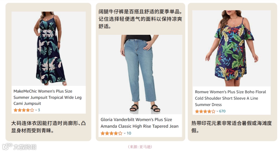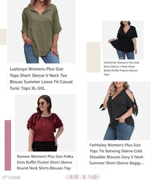 整体来看,亚马逊大码女装以基础款为主,色彩偏保守,设计缺乏时尚感,尺码范围有限,难以满足大码群体对“美丽与个性”的追求。建议卖家聚焦差异化设计,提升产品美学价值与个性化表达[k]。