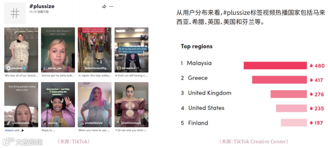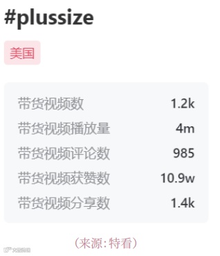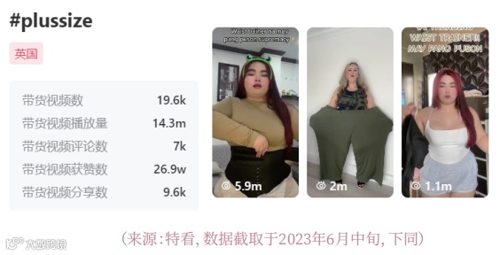 女装与女士内衣类目具备高度可视化特性,易于通过视觉内容吸引用户关注。以英国市场为例,#plussize标签在近一个月内带动超1.96万个带货视频,累计播放量达1430万次;美国同期相关视频约1200个,播放量亦接近400万,显示该细分赛道热度持续上升[1]。