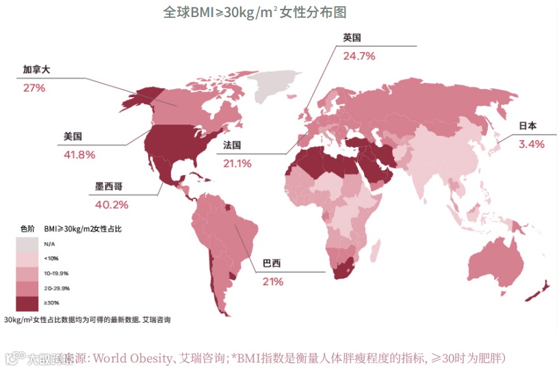 World Obesity数据显示,2022年全球BMI≥30 kg/m²的女性比例普遍超过10%,美洲、欧洲和亚太为核心市场。据NCD预测,到2030年该比例将突破20%,在需求增长与消费理念升级推动下,大码女装市场将持续扩张[k]。