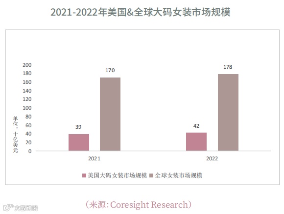 Coresight Research数据显示,2022年美国大码女装市场规模达420亿美元,同比增长9%,占全球市场的23.6%,为全球最大消费国[k]。美国女性平均尺码已从14码升至18码。NPD指出,2021年大码女装销售额较2019年增长18%,增速是其他女装品类的三倍以上。其中,文胸、内衣和塑身衣占大码女装总销售额的27%,仅次于休闲服[k]。