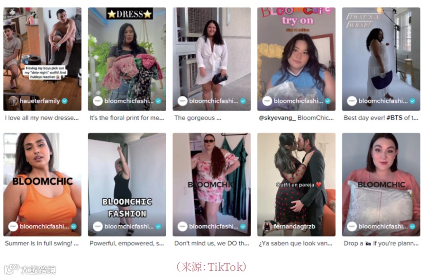 品牌在Instagram拥有45.5万粉丝,内容推送按服饰风格与使用场景分类管理;TikTok则聚焦穿搭展示、变装视频与用户开箱内容,#bloomchic标签相关视频累计播放量突破7040万次,依托用户生成内容(UGC)实现广泛传播[k]。此外,BloomChic已上线英国本地小店,并尝试通过直播带货触达更多潜在消费者[k]。