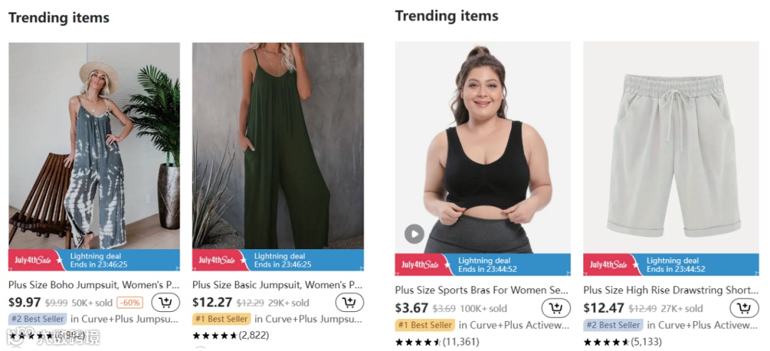 大码女装属于亚马逊美国站“服装、鞋靴与珠宝”类目。当前正值夏季,大码泳装、夏日裙装与上衣成为搜索热度较高的细分品类[k]。以“plus size women”为关键词,热销品类涵盖大码内衣(含内裤)、上衣、连衣裙与牛仔裤等。