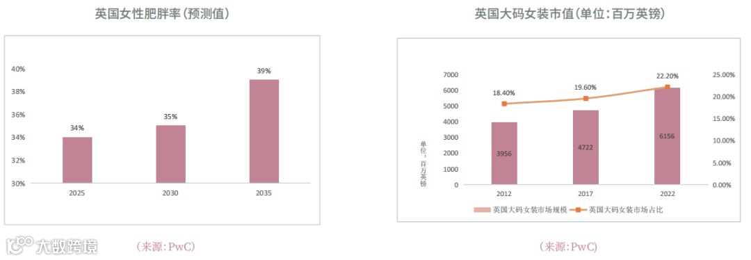 预计到2030年,英国肥胖人口占比将达35%,男女比例均衡,形成稳定的大码消费需求。2022年英国大码女装市场规模为6.16亿英镑,占女装市场总量的22.2%[k]。