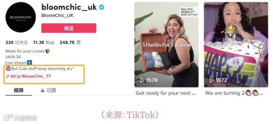 BloomChic TikTok英国子账号粉丝超7.1万,视频平均播放量超3000,但自2025年2月起更新频率显著下降,月均发布不足1条,账号引导用户跳转至品牌独立站[1]。