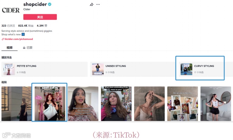 Cider通过社媒矩阵强化大码品类曝光,在Instagram与Facebook设立Cidercurve专属账号,并在TikTok主账号下设置“Curvy styling”专区。#cidercurve标签视频播放量超850万次[k]。品牌合作粉丝量约5万的大码KOL,单条试穿视频最高播放达55.8万次,凸显KOL种草在情感共鸣与转化中的优势[k]。