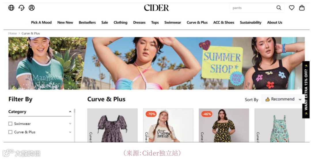 DTC品牌Cider在多轮融资后进军大码女装领域,主打原创设计,迎合欧美Z世代审美偏好。其大码系列与泳装设计更具年轻活力,突出穿搭表现力,目前尺码上限为4XL[k]。