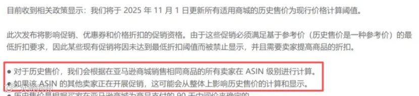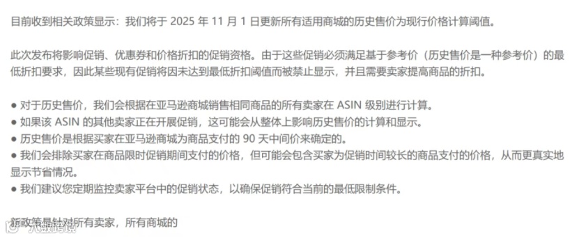 2025年11月1日起,亚马逊更新了所有适用商城的历史售价为现行价格计算阈值,这一新规将影响促销、优惠券和价格折扣的资格。