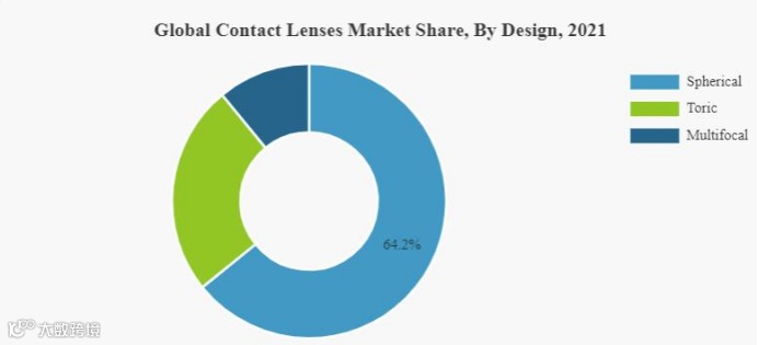 数据显示,2021年球面镜片占据64.2%的份额,市场参与者越来越关注推出技术先进的产品来满足球面镜片的日益普及。其次,由于散光以及镜片技术的更新,占据第二大市场份额的是复曲面的镜片。