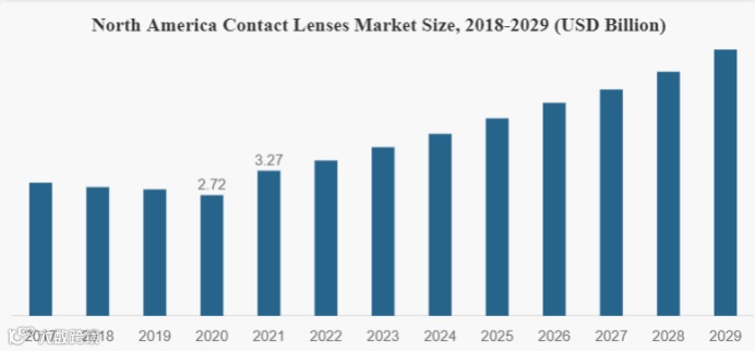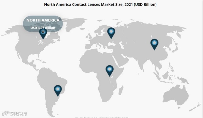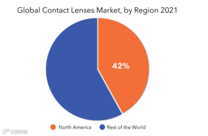 相关数据显示,北美主导隐形眼镜市场份额。2021年全球隐形眼镜贡献市场份额达32.7亿美元,占全球42%的比例。另外,据调查发现,2021年,美国有3100万隐形眼镜用户,而且人数还在逐年增加。