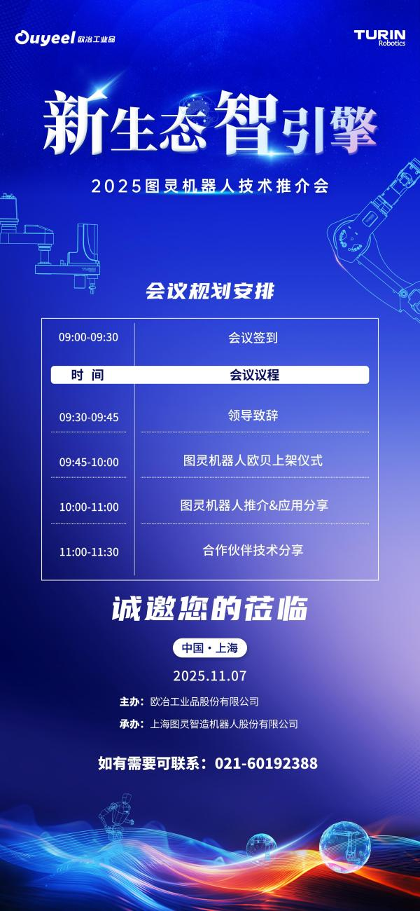 2025年11月7日(周五)9:30,“新生态·智引擎”——图灵机器人技术推介会将在上海宝山伊敦康得思酒店伊顿厅举行。本次活动由欧冶工业品主办,宝信软件图灵机器人承办,作为2025年中国国际进口博览会期间的重要同期活动之一,将面向中国宝武集团生态圈合作伙伴,打造一场聚焦智能制造与技术创新的行业盛会。
