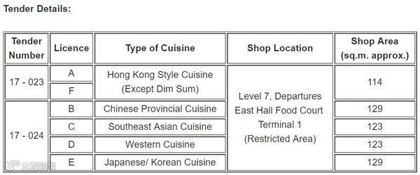 香港机场管理局通过穆迪对T1航站楼东大厅美食广场的餐饮经营权进行招标,涉及6个不同类别的执照,涵盖香港、中国大陆、东南亚、西餐及日韩美食[1]。店铺面积介于114至129平方米之间,被视为“亚洲航空枢纽的独特商机”[1]。招标截止日期为2017年11月30日[1]。(来源:The Moodie Davitt Report)