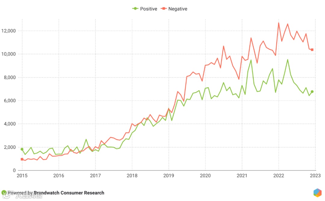 从 2015 年到 2019 年,海外消费者对可持续性关注度持续上涨,正面与负面的评价呈同步上升趋势,但近年来,负面评价首次超过正面。消费者解释道,因为经济下行导致的消费降级是主要原因,但仍对那些坚持可持续性发展的品牌抱有好感。