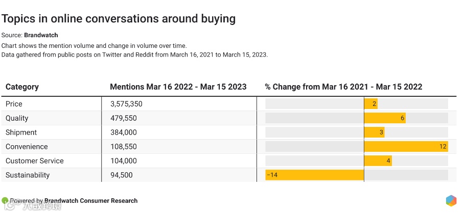 消费者在评估其购买决策时,品牌可持续理念的比重相对在今年有所下降,但总体来说,可持续性对品牌仍然十分重要。IBM 在 2022 年的一项调研中发现,51% 的受访者认为,可持续性的重要性甚于上年,从一组网上讨论数据来看,2022 年的可持续性网络热度同比增加了 12%。