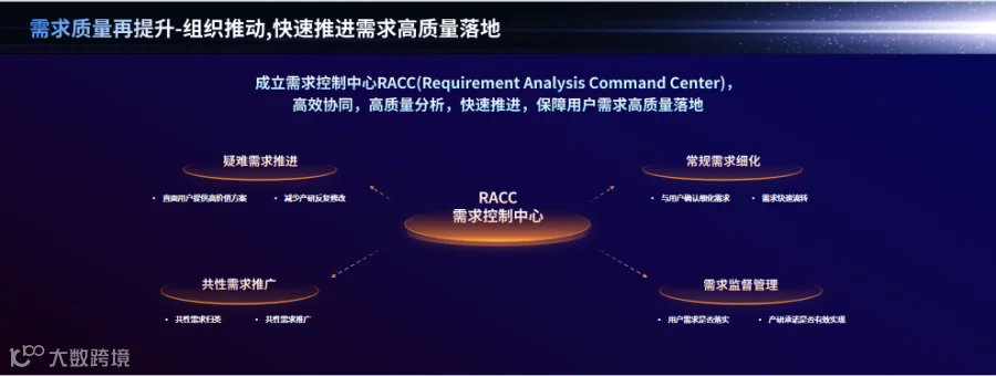组织牵头保障需求落地:技术高管牵头成立需求控制中心(RACC),集中解决疑难需求,推广共性方案,内部监督工期,确保需求高质量快速响应。