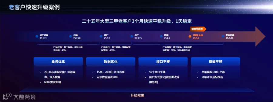老客户快速升级:采用“两平移两优化”策略,在接口和单据模板快速复制平移、业务流程平移基础上,进行针对性优化。数据工具化治理和全量迁移,这样中型医院可实现2个月平稳升级、大型医院3个月平稳升级。