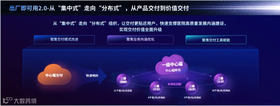出厂即可用2.0从1.0模式的一个中心端,转为“1+4”的分布式中心化组织,以组织形态的重塑,赋能价值交付路径。“1”级中心端聚焦交付模式改进、业务内涵优化与交付工具赋能三大重点;4个区域中心端更侧重价值交付的执行落地。