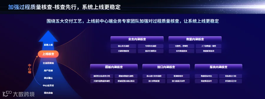 上线前核查保障:围绕业务、数据、模板、接口、报表五大模块,上线前中心端专家团队质量核查,确保系统稳定上线。