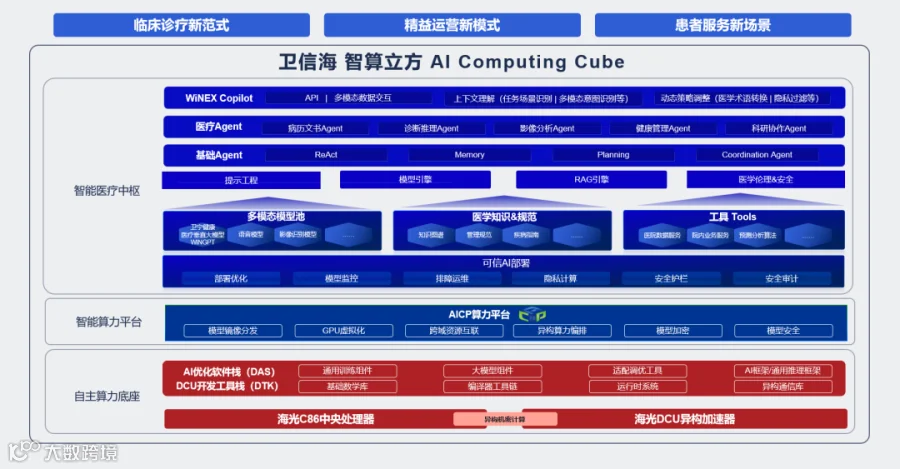 卫宁健康联合深信服、海光信息推出中心级智算一体化产品“卫信海智算立方AI Computing Cube”。提供预优化、预集成的全栈式AI基础设施,让AI 成为医院“即开即用”的原生能力。