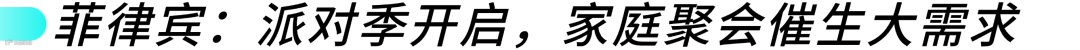 菲律宾是东南亚圣诞氛围最浓的国家之一,消费需求从8月一直持续到12月,堪称“圣诞最长季”。热闹的家庭聚会带来庞大的场景消费需求,发光装饰、聚会道具、互动礼品潜力巨大,相关品类搜索热度稳居区域榜首。