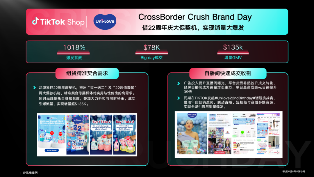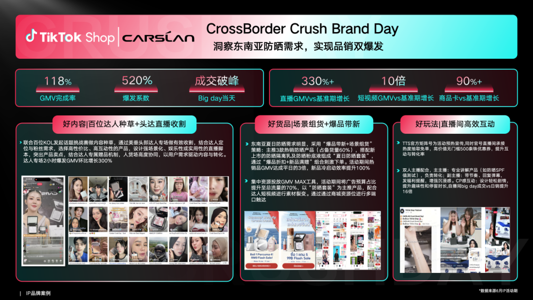 品牌通过跨境自有IP「Crush Brand Day」成功实现新品防晒隔离乳与粉底液套装的冷启动。前期借助内容种草预热,叠加IP专属货品补贴,迅速拉动新品销量,并推动品牌在TikTok全域实现热度爆发,为新品上市打造了高效的开局路径。