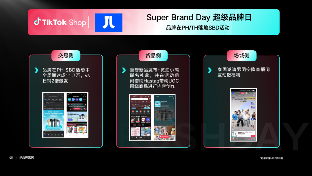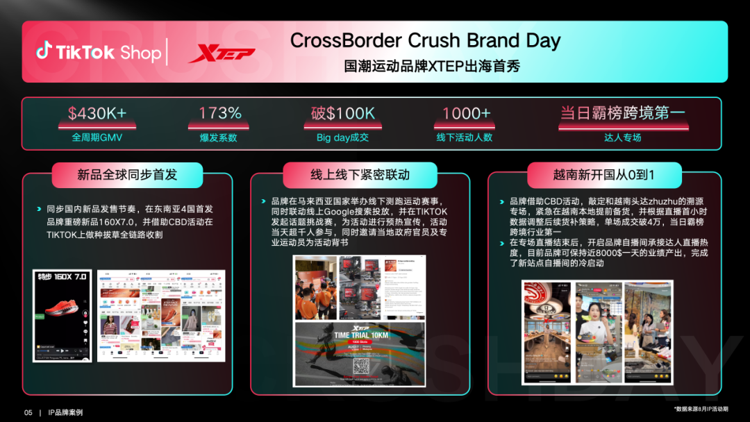 今年的Q3季度,参与营销IP活动的商家中,美妆品牌CARSLAN单日GMV爆发系数达520%,家电品牌JISULIFE在菲律宾活动全周期达成11.7万美金销售额,运动户外品牌XTEP四国首发新品Bigday成交破10万美金……