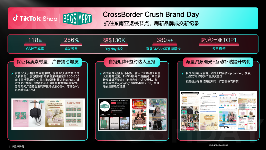Bagsmart借势东南亚开学季,精准切入校园消费场景,通过参与跨境自有IP「Crush Brand Day」推出“校园通勤包套装”,以短视频突出多口袋、防水等实用功能,精准触达学生群体与职场新人,实现场景化拓圈。