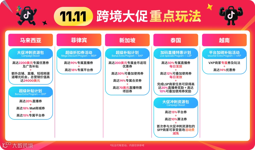 商家老板们!TikTok Shop东南亚年度重磅大促即将来袭!11.11超级大促近在眼前,我们精心准备了超30种玩法与福利,等您来领取。🔥