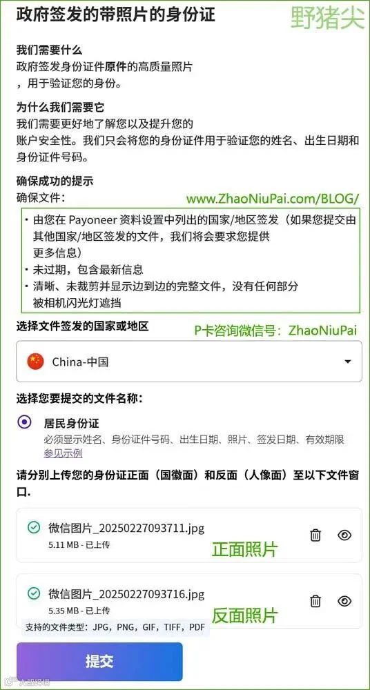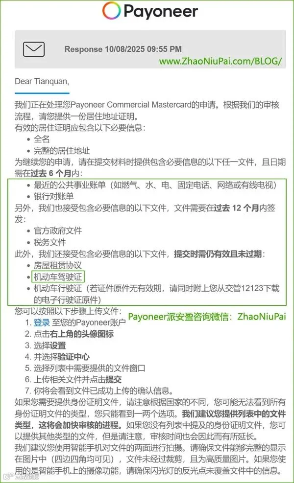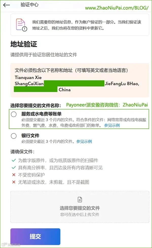 3)若提供的地址证明不能完整地显示注册者的姓名(或公司名、法人名)和地址,将会被Payoneer派安盈驳回。除了现在非常普遍的驾照外,提供最近一年内新签发的居民身份证也是可以的。野猪尖 www.ZhaoNiuPai.com/BLOG/