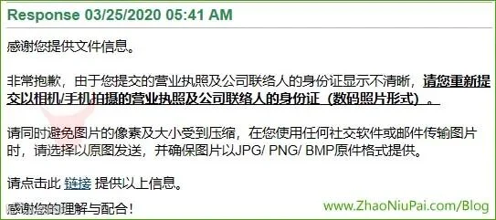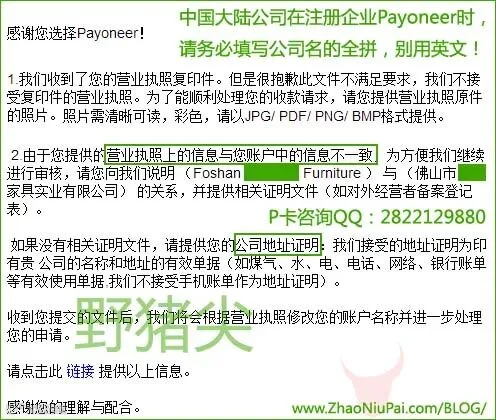 Payoneer不接受营业执照的复印件,并要求证明中英文名对应