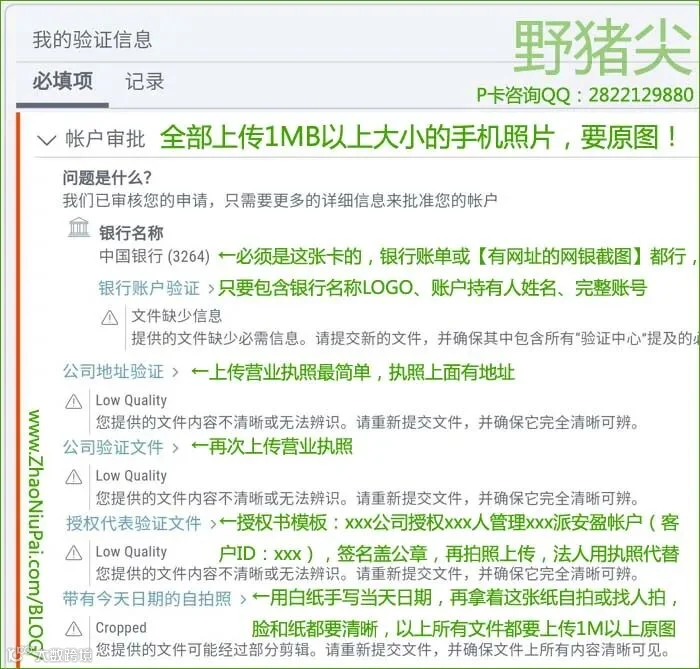 1)由于监管政策收紧,Payoneer派安盈对客户资料的要求越来越高。根据野猪尖的经验,以国内身份注册P卡账户的第1步要用拼音填写姓名(或公司名),第2步要填写详细到门牌号的拼音地址,第4步要填写注册者本人(或本公司、法人)的国内银行卡,审核时要提供清晰的身份证、营业执照相片。但是很多客户并不知道这些细节,注册界面也没有足够通俗易懂的提示,所以在注册时随便填写一个笼统的地址、绑定他人的银行卡,导致账户审核延误。大家在注册Payoneer派安盈帐户之前,建议参考我之前写的【Payoneer派安盈申请教程:个人账户、企业账户】。