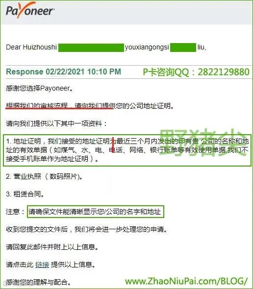 ▲Payoneer派安盈邮件要求提供居住地址证明