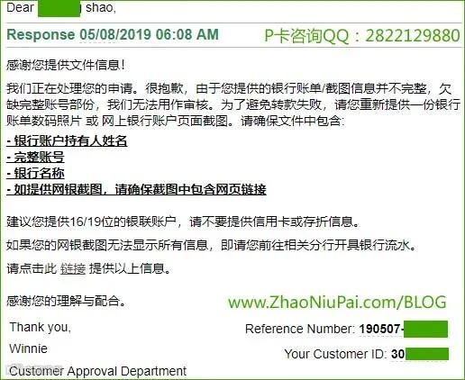 6)由于注册Payoneer时填写的银行信息有问题(比如中国人却用了英文名,或绑定了非本人的银行卡),有些朋友在P卡审核时会收到邮件,让提交银行账单/截图。你可以到银行打印对账单,或提供这张卡的网银截图,要求清晰地显示银行名称LOGO、网址、持卡人姓名和账号。若以公司名义注册时填了授权代表(非公司法人)的银行卡,派安盈审核时会要求补充“授权书”。