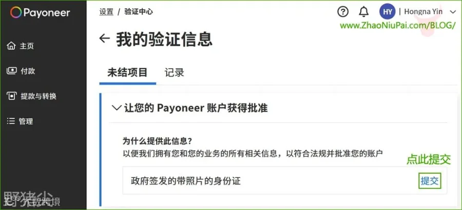 5)Payoneer派安盈注册提交后,开始人工审核,期间务必及时登录P卡后台→右上角设置→验证中心→未结项目,在这主动提交注册证件——个人帐户需要提供注册者本人的身份证,公司帐户要提供营业执照和法人身份证。有的还要提交地址证明、银行对账单之类的文件,请留意邮件或P卡后台,以免耽误审核。