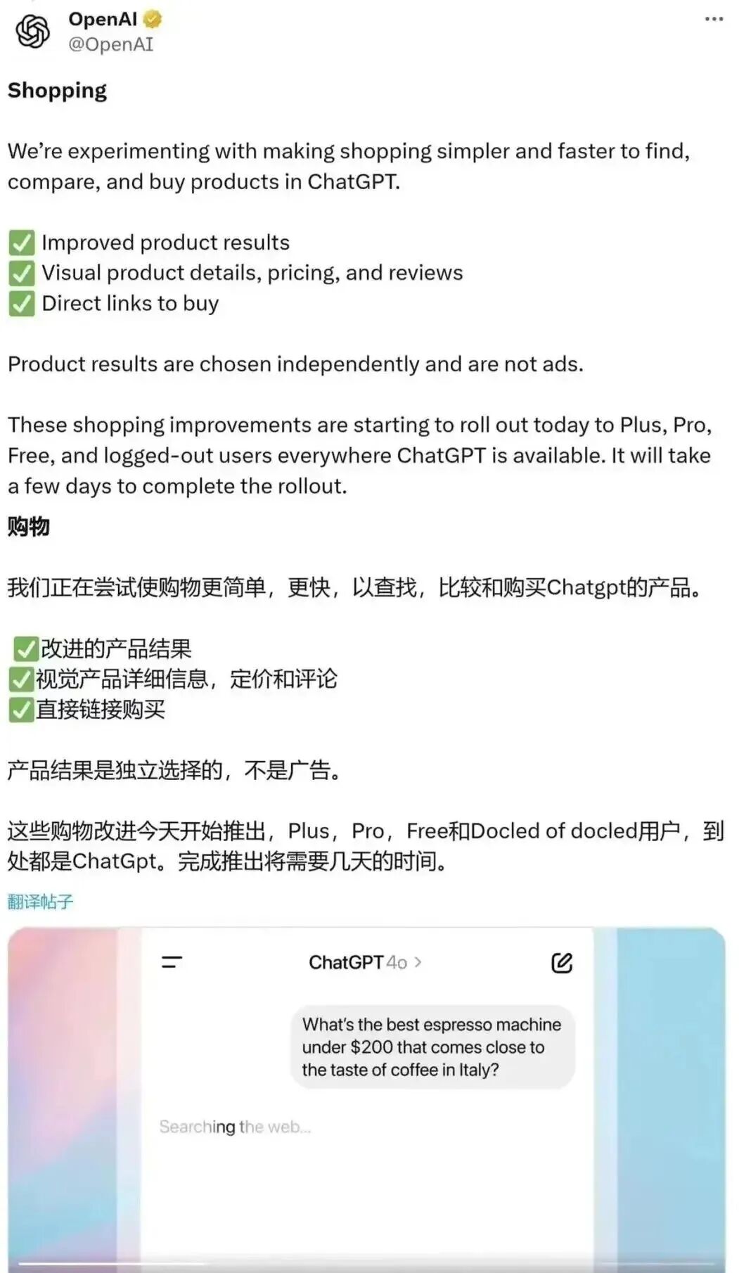 此前OpenAI正式宣布推出即时结账功能时,最先在美国的Etsy上线。后续预测将有超过一百万家Shopify商家加入,包括Glossier、Skims、Spanx和 Vuori。