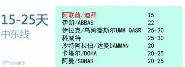 中东航线中,迪拜因地理位置优势,最快可达;其他阿拉伯国家港口普遍需20天以上,整体航程在15至25天之间[k]。
