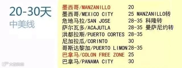 至墨西哥约需20天,其他中美洲港口一般在28至35天之间。得益于巴拿马运河,该区域海运较为便捷[k]。