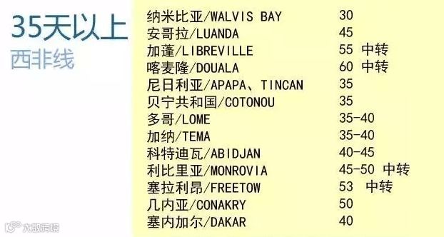 西非港口因需绕行非洲东部,航程普遍超过35天,重要港口约35天,偏远或需中转的小港可达50天左右[k]。