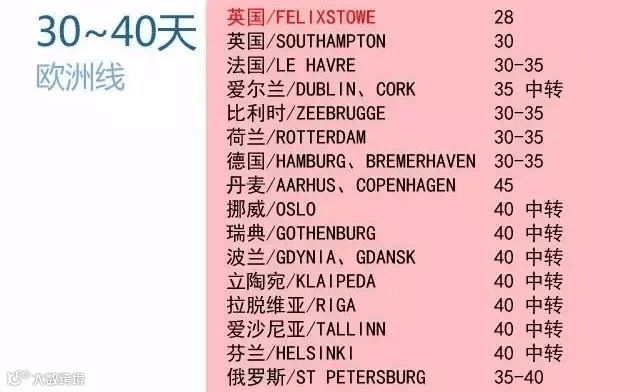 中国至欧洲主要港口海运时间在30至40天之间,英国弗利克斯托最短约28天,北部欧洲多数需中转,耗时超过40天[k]。