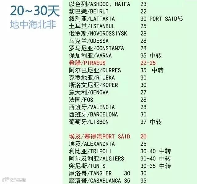 地中海东部港口如埃及赛得港约需25天,西部西班牙、葡萄牙等国港口约需30天,部分小众港口可能延迟至40天到港[k]。