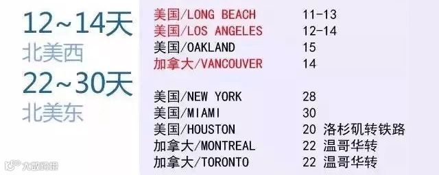 中国至北美西部港口约需12至14天,东部港口因需绕行,直达约需25至30天。多数货主选择“海铁联运”:货物先运至西部港口,再通过铁路转运至东部,总时长约22天[k]。