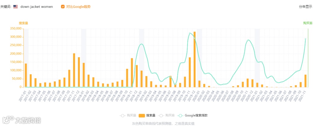 女式羽绒服及棉服属于典型季节性品类,以亚马逊美国站近五年销售数据为参考,其销售旺季集中在每年11月[k]。 以下分析基于2021年12月上旬的市场数据,结合销量、定价、竞争、评价及供应链等多个维度,对女式羽绒服品类进行深度解读[k]。