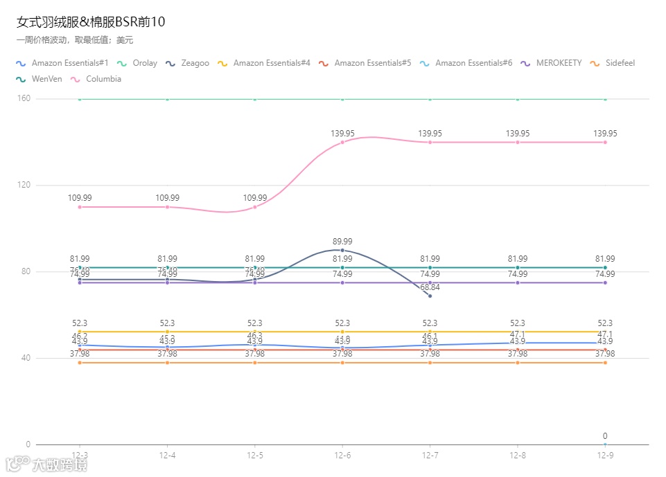 以2021年12月3日至9日为观察周期,BSR前10产品价格整体稳定,仅个别品牌如Zeagoo和Columbia出现较明显调价[k]。 羽绒服产品因颜色、尺码等变体丰富,如Amazon Essentials单链接变体超100个,具备较强SKU管理能力成为运营关键[k]。