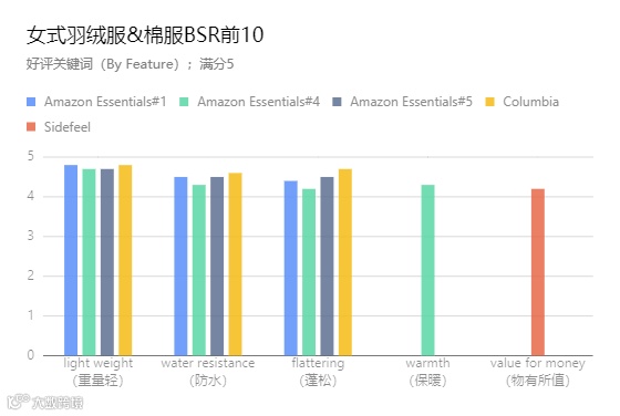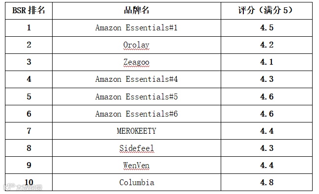 BSR前10产品中,5星好评占比普遍超过50%[k]。 例如Amazon Essentials的7000+条评论中,5星占比达72.2%,表明成熟产品具备较强口碑优势[k]。