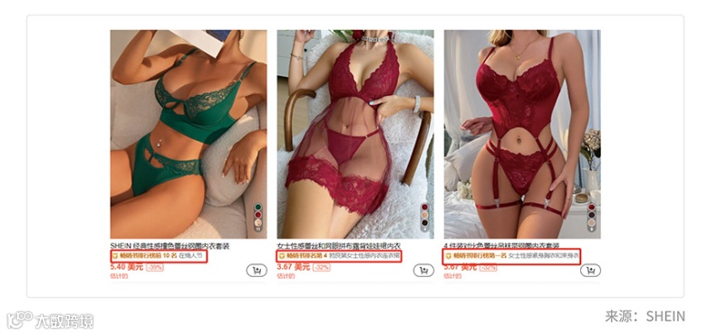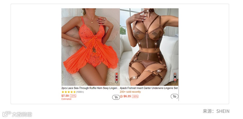 SHEIN将情趣内衣细分为女士、大码、男士三大类,女士款定价多在5美元以内,材质以蕾丝、真丝为主,设计强调开洞、绑带,流行黑色、褐红、深蓝及一体式连体装[k]。