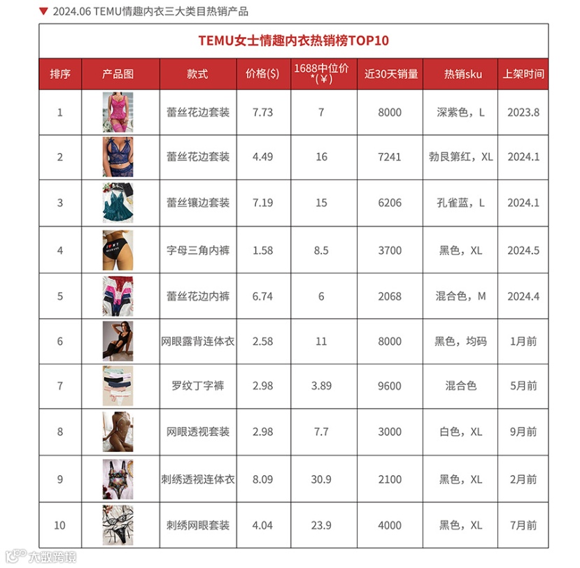 售价普遍在1-5美元,均价2-3美元,主推入门级市场。热销款以黑白或清新色系的蕾丝文胸套装、花纹丝袜、蕾丝三角裤为主[k]。