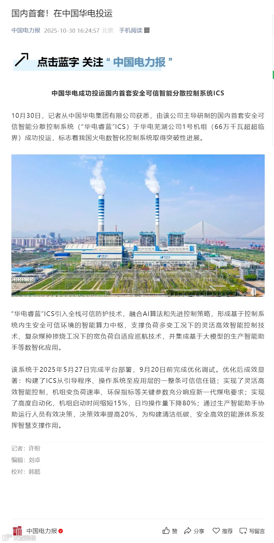 10月30日,记者从中国华电集团有限公司获悉,由该公司主导研制的国内首套安全可信智能分散控制系统(“华电睿蓝”ICS)于华电芜湖公司1号机组(66万千瓦超超临界)成功投运,标志着我国火电数智化控制系统取得突破性进展。